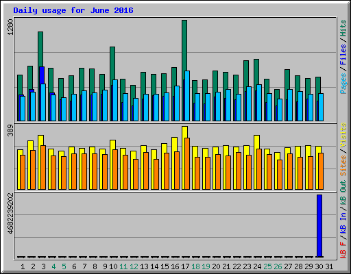 | Day | Hits | Files | Pages | Visits | Sites | kB F | kB In | kB Out | ||||||||